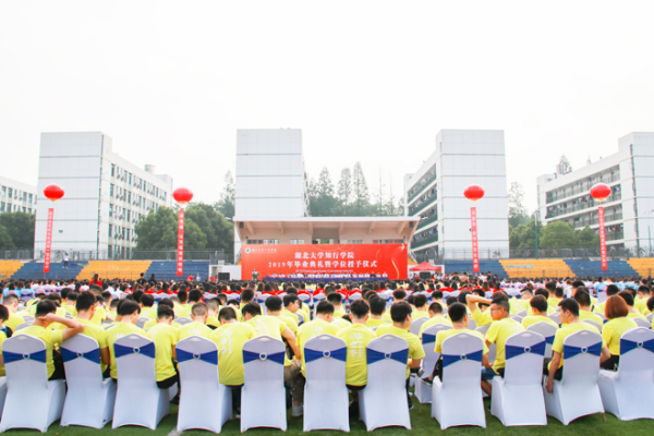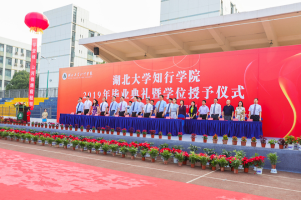 六月知行,栀子花开,骊歌唱响。6月14日上午,湖北大学知行学院2019届毕业典礼暨学位授予仪式在田径运动场隆重举行。2019届全体毕业生带着母校的祝福开启人生新航程。校党委书记彭德忠主持仪式。校长卜诗桢深情寄语全体毕业生“做一个有担当的知行人”。全体校领导、特邀嘉宾新建中环集团董事长胡国红、各职能部门、各学院负责人和教职工代表、毕业生家长代表出席典礼仪式。