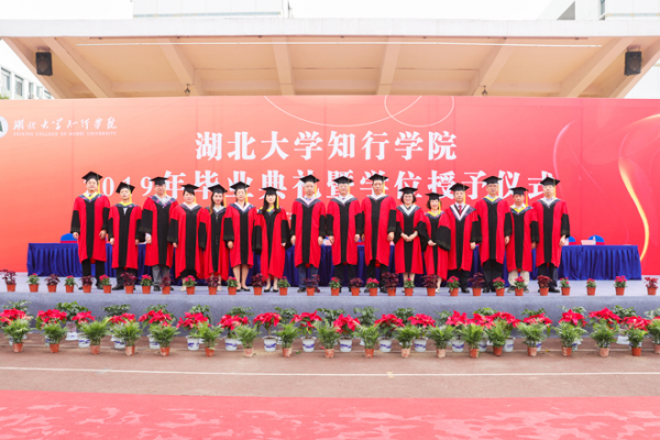 典礼最后,全场齐唱毕业歌《我们都是追梦人》,引起了强烈的现场共鸣,全体毕业生将对母校的深情融入到歌唱中,表达了对未来的信心,共同祝愿知行明天更美好。典礼在感怀母校、追忆青春的氛围和依依惜别的歌声中落下帷幕。学位授予仪式上,校党委书记彭德忠、校长卜诗桢等学位评定委员会委员为毕业生拨穗正冠,授予学位,颁发证书,并合影留念。临别之际,学校和各学院还通过形式多样的活动表达了对毕业生的美好祝福。