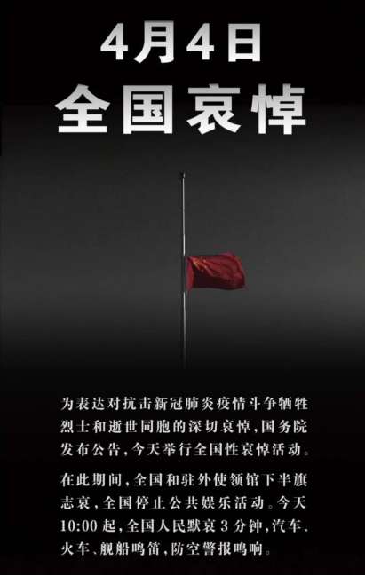 2020年4月4日,国旗半垂,举国同悲。庚子年清明节,全国各地各族人民深切悼念抗击新冠肺炎疫情斗争牺性烈士和逝世同胞!