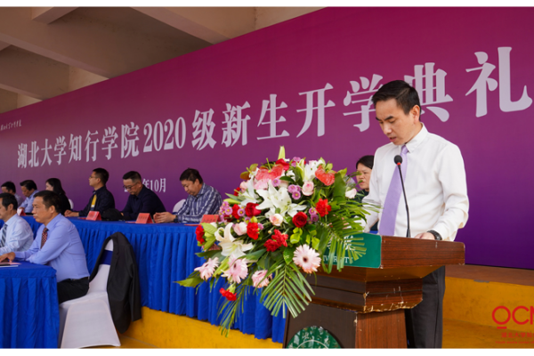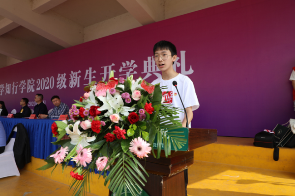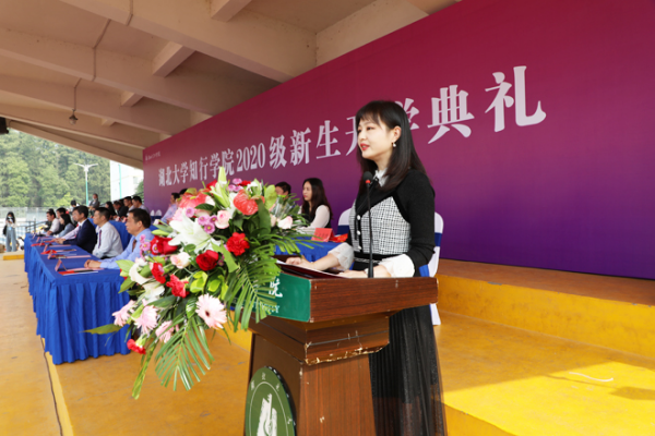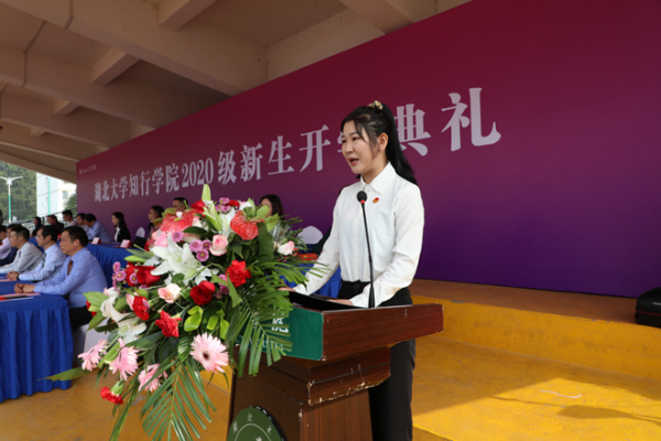 人文学院新闻专业17级学生赵爽作为在校生代表发言,她结合自己的大学学习生活经历,鼓励学弟学妹们要赤子丹心,热爱祖国,不负时代;要行胜于言,躬身实践,不负韶华;要以知践行,自强不息,不负青春。2020级新生代表谢文锦同学在发言中表示将铭记“厚德载物,认知践行”的校训,怀揣对未来的美好期盼,在湖北大学知行学院这片滋养青春梦想的沃土上,丰满羽翼、振翮九霄。教师代表文小静表达了对2020级新同学的祝福,希望同学们珍惜时光,在“厚德载物,认知践行”的校训中,永远做一名知行精神的传承者,践行者,身怀爱国之情,坚守报国之志,珍惜韶华,奋发有为,书写属于自己的非凡人生。