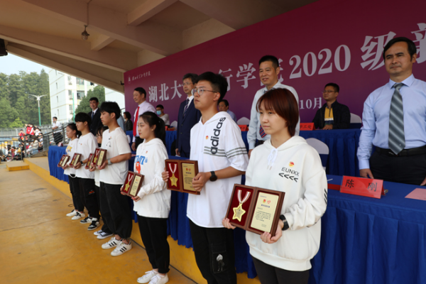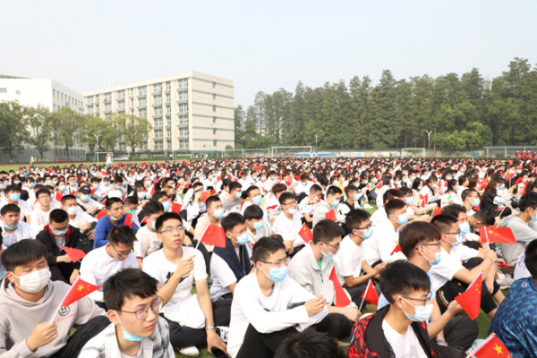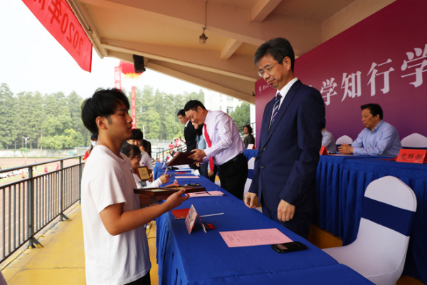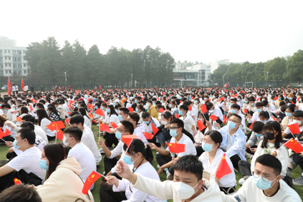 足球场上,3700余名学生身着白色上衣,手持小国旗,以学院为单位站成方阵。开学典礼前,红杉林合唱团的10余名同学走到操场上,带领全体新生一起大合唱。“总是要到睡觉前才知道功课只做了一点点,总是要等到考试以后才知道该念的书还没有念……”在合唱声中,全体新生挥动着手中的国旗回忆着少年时光。随后,全体新生还合唱了《少年》《曾经的你》等学生们耳熟能详的青春曲目。“现在开始新生点名……计信学院”“到!”伴随着新生整齐的应答声,新生开学典礼正式启动。学校疫情防控工作办公室主任刘张虎宣读2020级新生“青年抗疫先锋”表彰决定,学校领导为获评“青年抗疫先峰”的同学颁发奖章和荣誉证书。