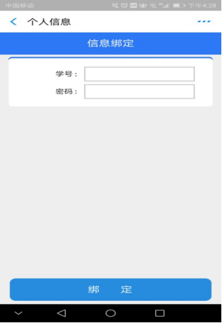 5.进入个人信息界面,输入学号或报名号(新生为报名号)和密码(密码为学生身份证后六位),点击绑定。