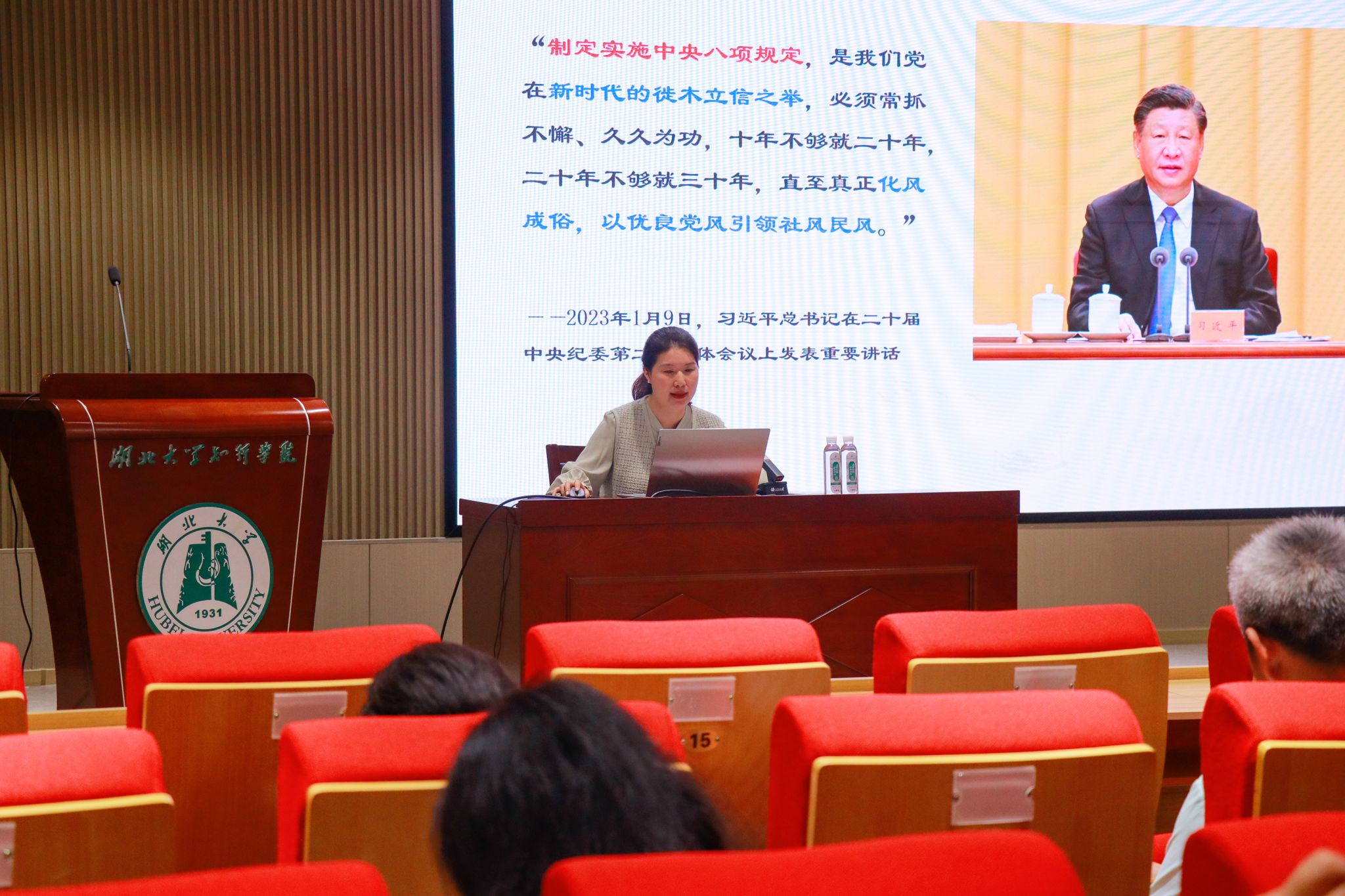 报告中,胡正燕以《徙木立信与国之大者》为题,从“学习领会中央八项规定精神”“深入贯彻中央八项规定精神——中国共产党坚持的‘徙木立信’之举”“深入贯彻中央八项规定精神——中国共产党追求‘国之大者’的必然选择”三个方面进行了讲解。讲解中,她深刻阐释了习近平总书记关于加强党的作风建设的重要论述,并结合具体案例,深入浅出地介绍了中央八项规定精神的丰富内涵,强调了深入贯彻中央八项规定精神是加强党的政治建设的必然要求,是加强反腐败斗争的必然选择,要锲而不舍落实中央八项规定精神,推动作风建设常态化长效化。