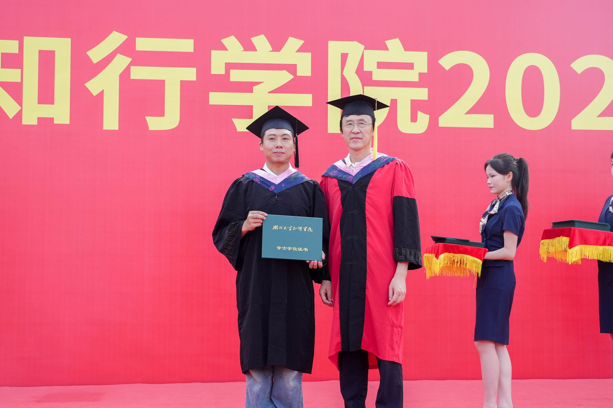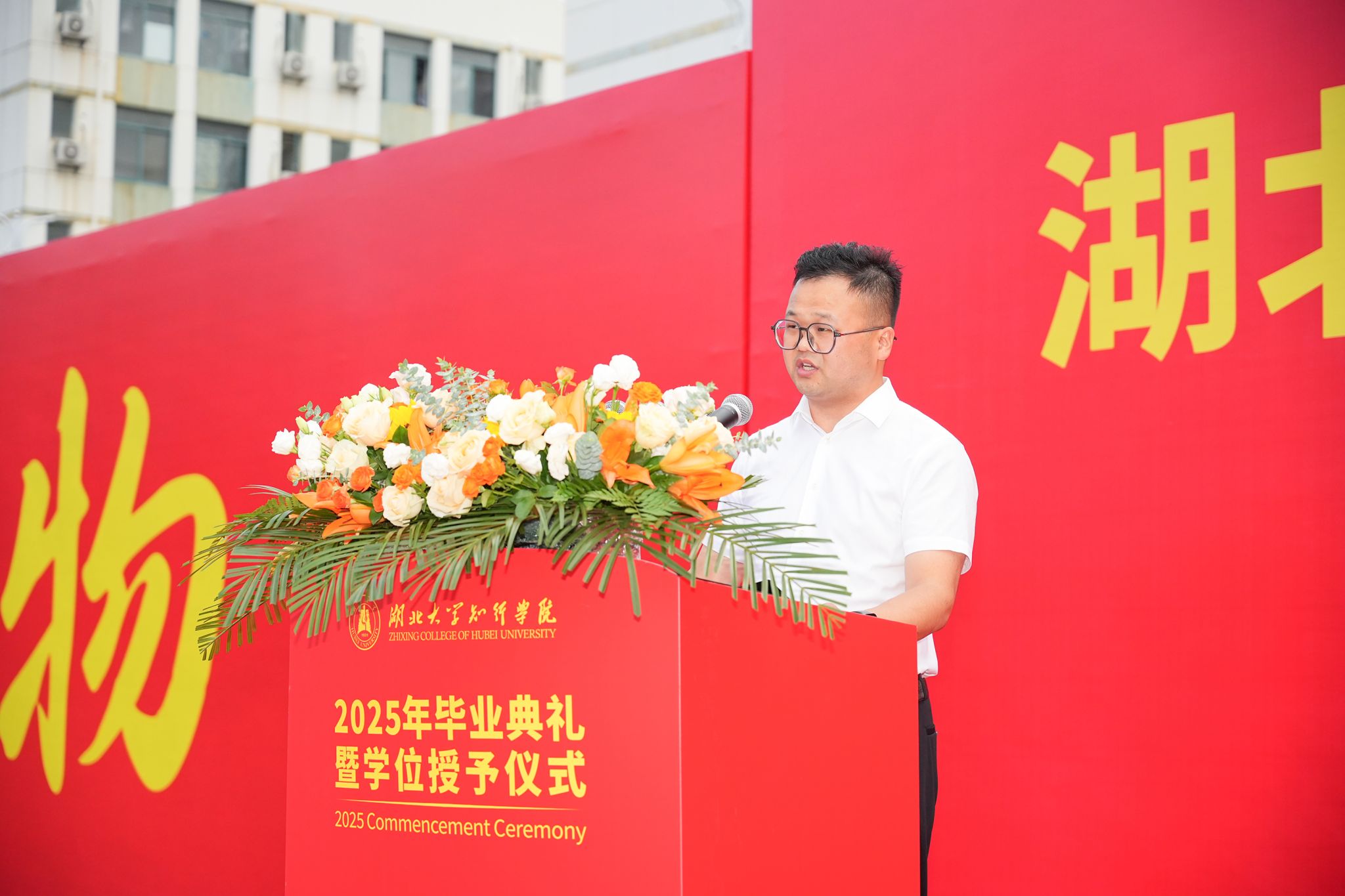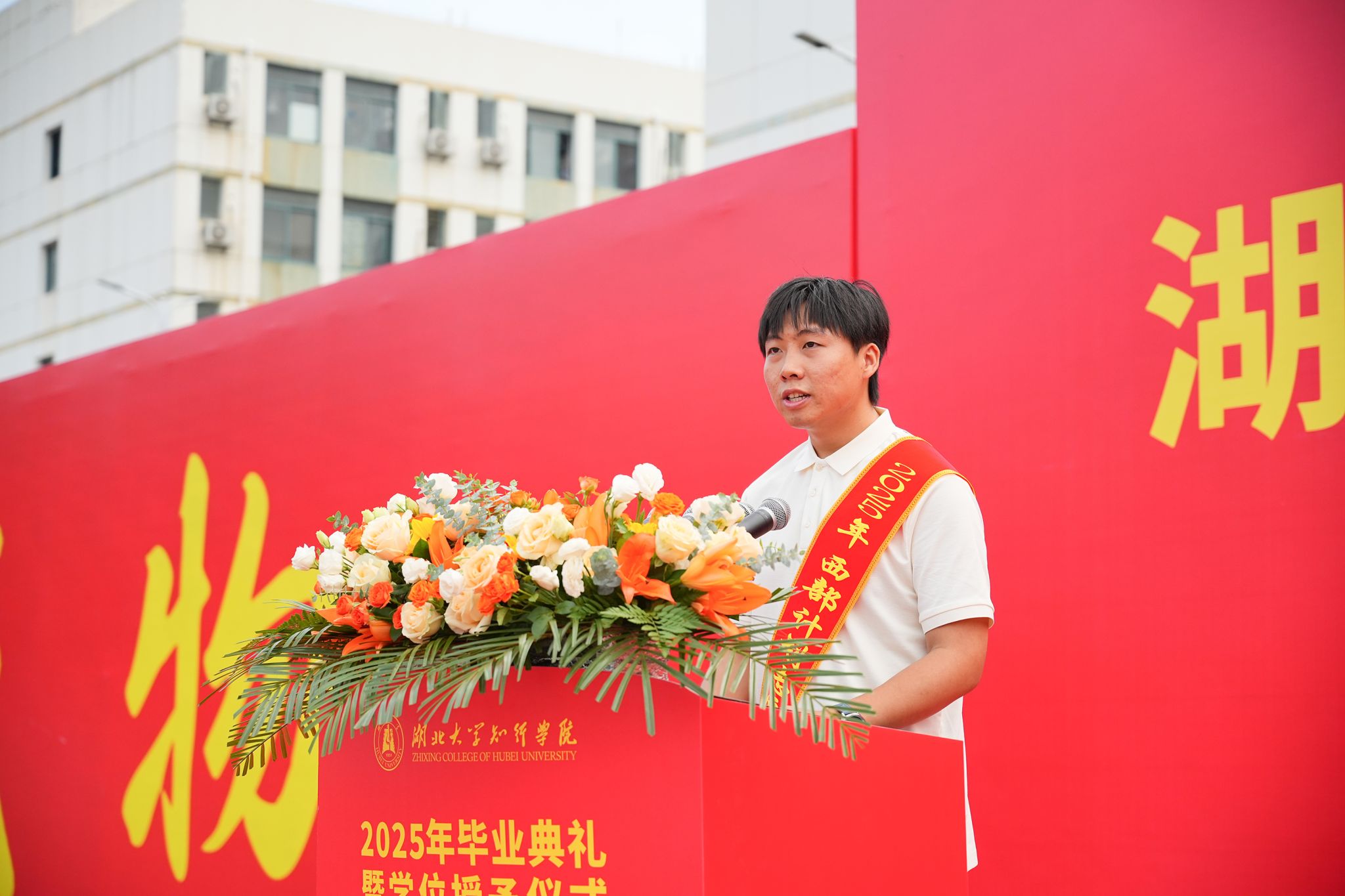 党委副书记黄智凌为优秀毕业生代表颁奖。教师代表肖凯深情回顾了与同学们朝夕相处的点滴,表达了对毕业生的美好祝福。计算机与信息工程学院2013届校友、武汉市海联天下物联网有限公司董事长方规深情回忆了在知行的求学时光,勉励学弟学妹们志存高远,脚踏实地,乐观向上,持续优化人生算法,做幸福的追光者,在时代的大潮中乘风破浪。“中国大学生自强之星”、外国语学院刘彬作为毕业生代表发言,他深情回顾了难忘的大学生活,并表示将以“厚德载物 认知践行”的校训精神激励自己开启人生新征程,用所学所知回应时代之问,用拼搏与奋斗书写青春答卷。