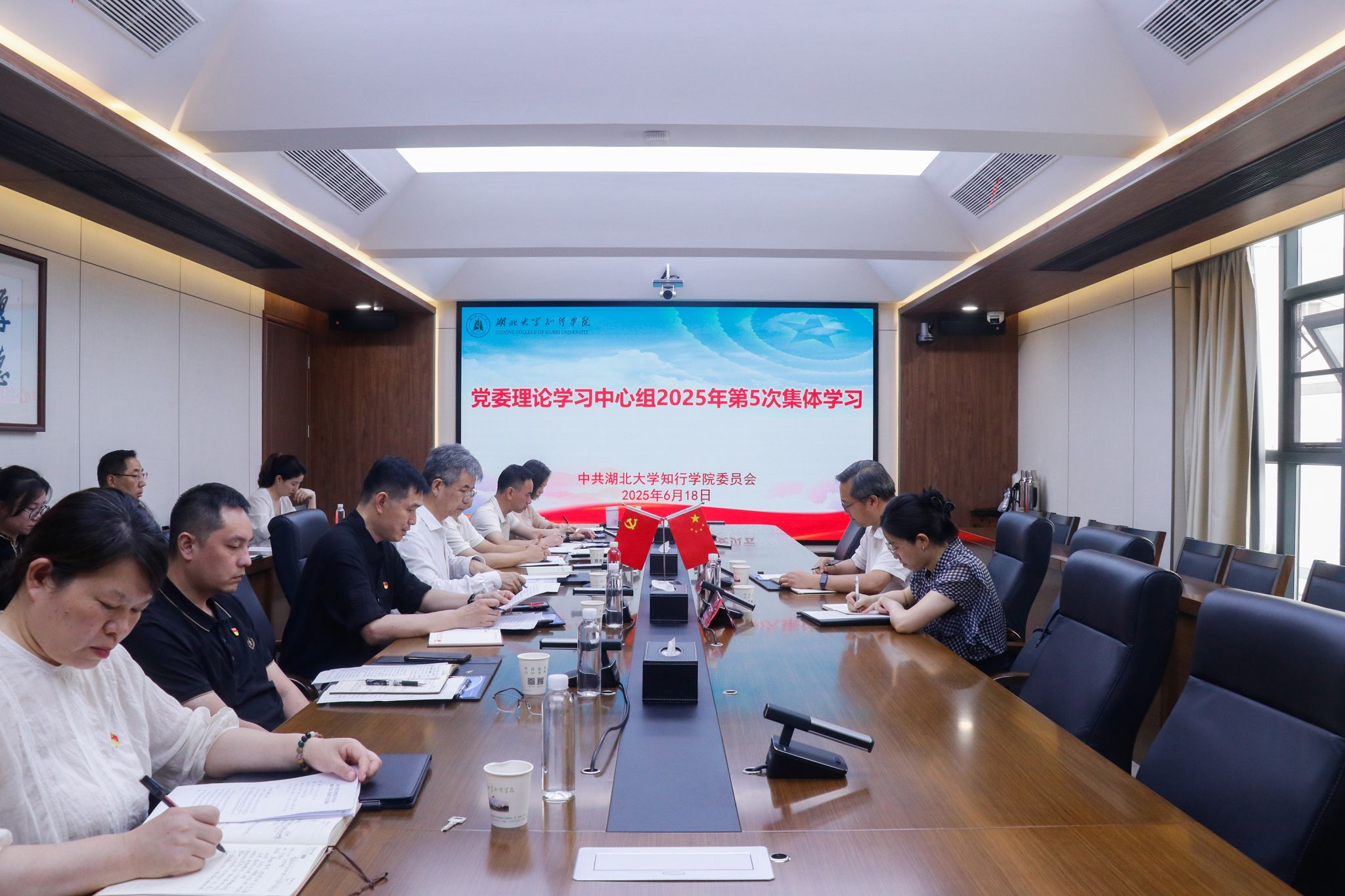 根据学校深入贯彻中央八项规定精神学习教育工作安排,6月18日下午,学校党委理论学习中心组开展2025年第5次集体学习。湖北大学第九巡听指导组秦明君、覃红英出席学习会。知行学院党委班子成员及相关职能部门负责人参加学习。党委书记彭德忠主持学习。