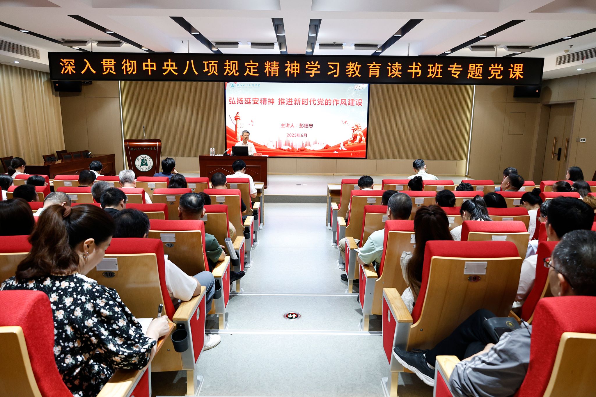 6月19日,学校举办深入贯彻中央八项规定精神学习教育读书班专题党课暨党委理论学习中心组(扩大)2025年第6次集体学习。党委书记彭德忠讲授专题党课。全体在校校领导,全校中层干部,各党总支、直属党支部委员参加会议。