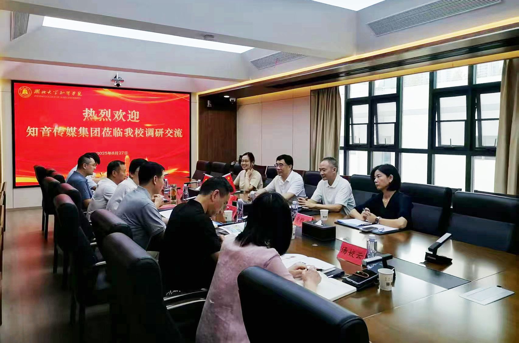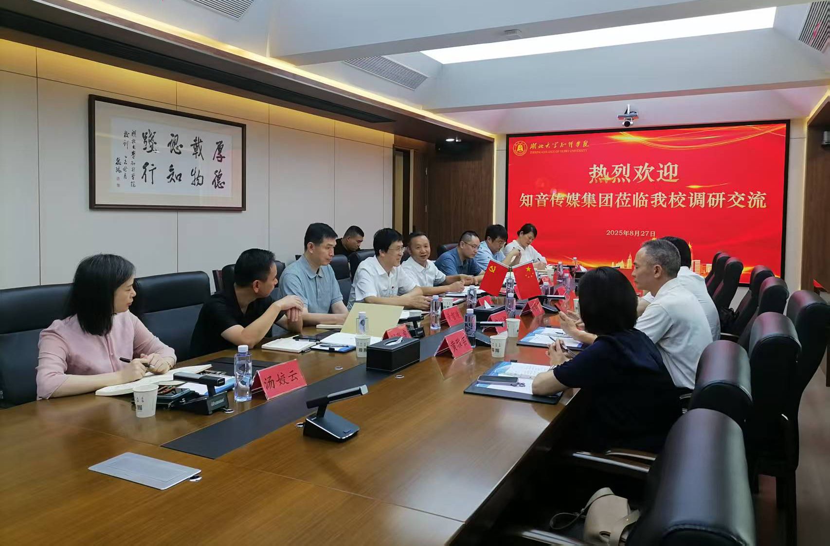 8月27日下午,湖北知音传媒集团董事长、党委书记刘学明,集团总经理宋以超,集团下属高校武汉信息传播职业技术学院党委书记、校长许婷一行来我校,就校企合作开展交流座谈。党委书记高连顺、院长何顺进热情接待了来访客人。学校党政领导班子成员参加交流座谈。